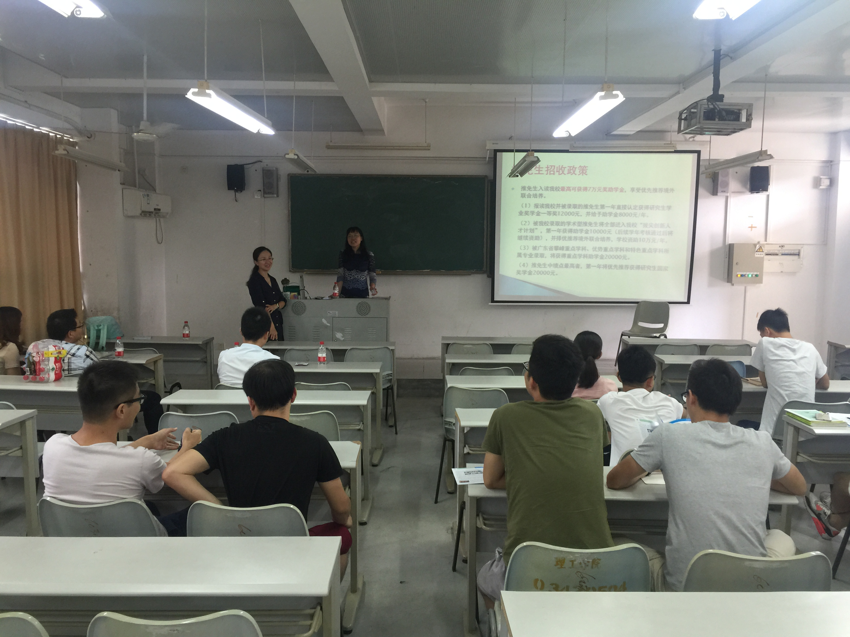 2017年9月26日上午10点,广东工业大学轻工化工学院院长助理郑育英教授和研究生办公室马巍老师在腐漫画 研究生办公室工作人员陪同下,来到教学楼6C302为腐漫画 的考研学子展开招生宣讲。