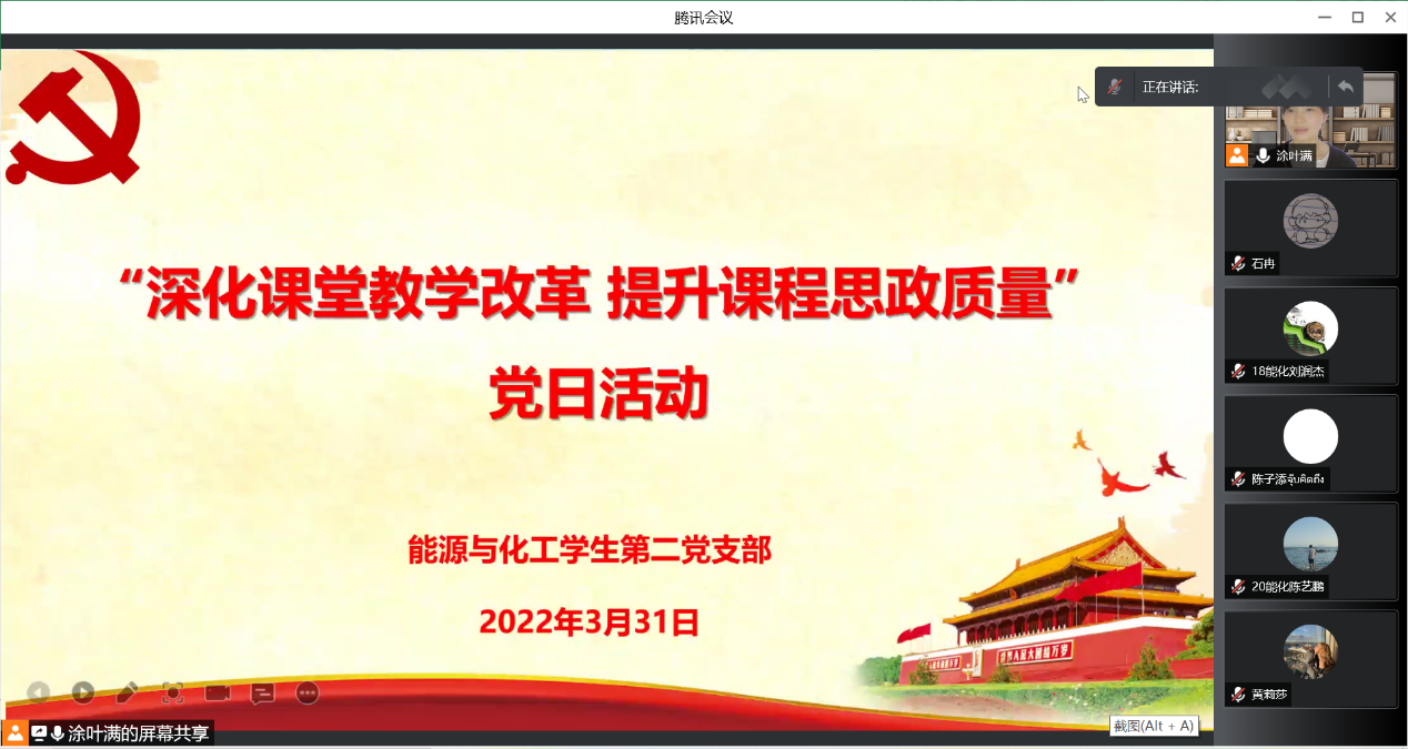 2022年3月31日下午,能源与化工学生第二党支部于腾讯会议开展了“深化课堂教学改革,提升课程思政质量”主题党日活动,会议由支部书记涂叶满主持。会议集中学习了习近平主席2022年新年贺词,聆听贺词,让与会的每位师生党员备受鼓舞,深受感动。随后,涂...