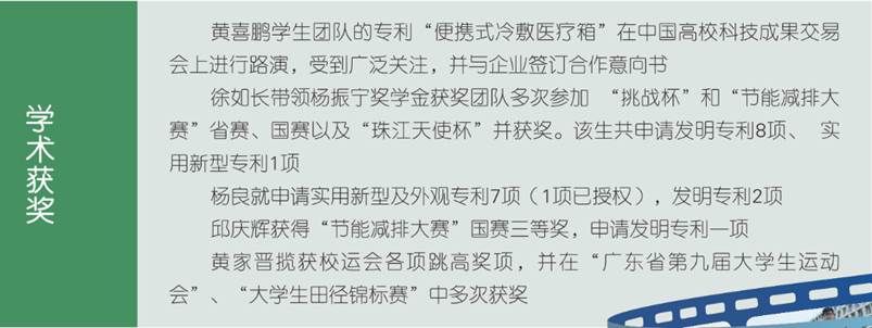 近三年来,学生主持学校的创新创业训练项目达100多项,参与学生达400人次以上,学生在各类大学生科技竞赛活动中,超过100人次获得包括全国大学生节能减排社会实践与科技竞赛、中国制冷空调行业大学生科技竞赛、“挑战杯”广东大学生课外学术科技作品竞赛”、“挑战杯·创青春”广东大学生创业大赛等省级以上奖励。学生在国内外期刊发表论文26篇,其中SCI/EI收录7篇,核心论文6篇;申请发明专利和实用新型专利30余件,授权12项。