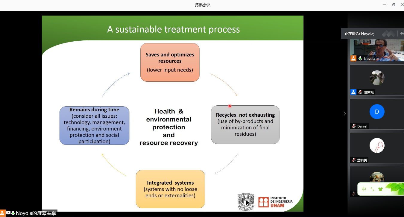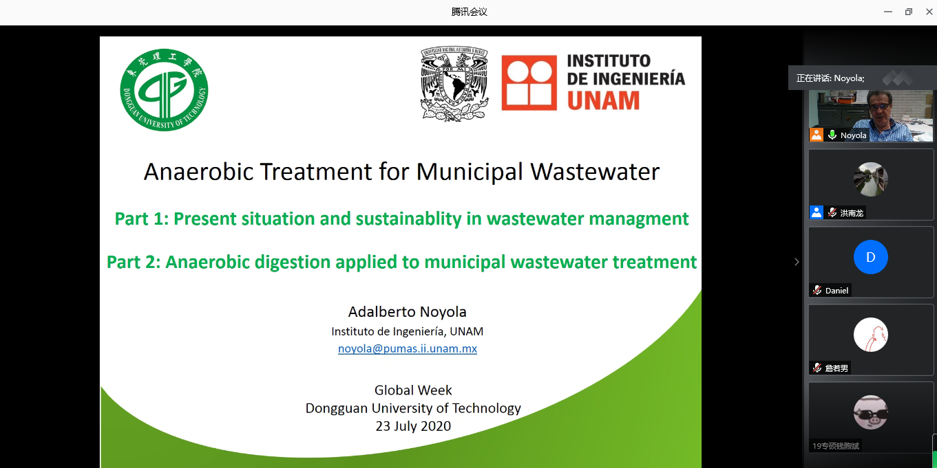 2020年7月23日早上,Prof. Adalberto Noyola为学生们讲授了题为“Anaerobic treatment for municipal wastewater”的前沿讲座,课时长达2小时,主要内容是关于城市污水厌氧处理的前沿技术和设备。讲座期间所有同学均采用全英交流,同学们都表现出浓厚的学习兴趣,纷纷表示了环境治理的重要性和紧迫性。