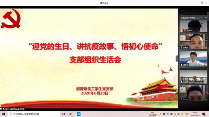 应化与食品学生党支部和能源与化工学生党支部分别于6月30日在腾讯会议召开“迎党的生日、讲战疫故事、悟初心使命”支部组织生活会。会议由应化与食品学生党支部书记张博和能源与化工学生党支部书记涂叶满主持。