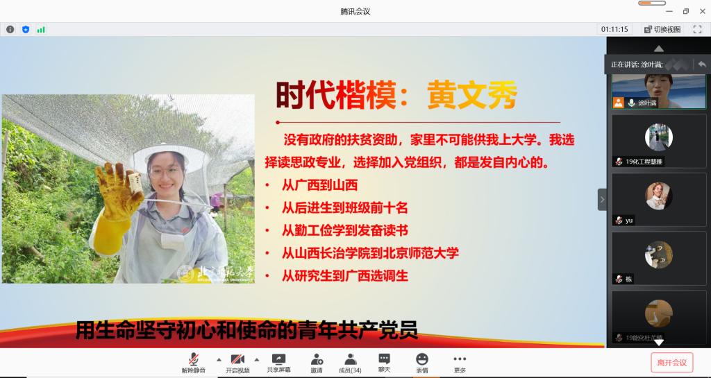 涂叶满老师首先以时代楷模黄文秀为引子,深刻剖析了两个值得深思的问题:为什么要入党以及为什么要从思想上入党?她指出,新时代青年作为实现中华民族伟大复兴的生力军,必须全心全意为人民服务。要像黄文秀同志那样,用生命坚守初心和使命,用实际行动诠释“不仅要在组织上入党,更重要的是在思想上真正入党”的誓言。