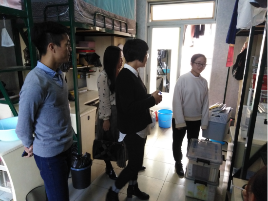 党委副书记柳卓君,辅导员谢真葵老师、刘哲老师、张博老师一行走访了学生宿舍,与寒假留校学生进行了亲切交流。