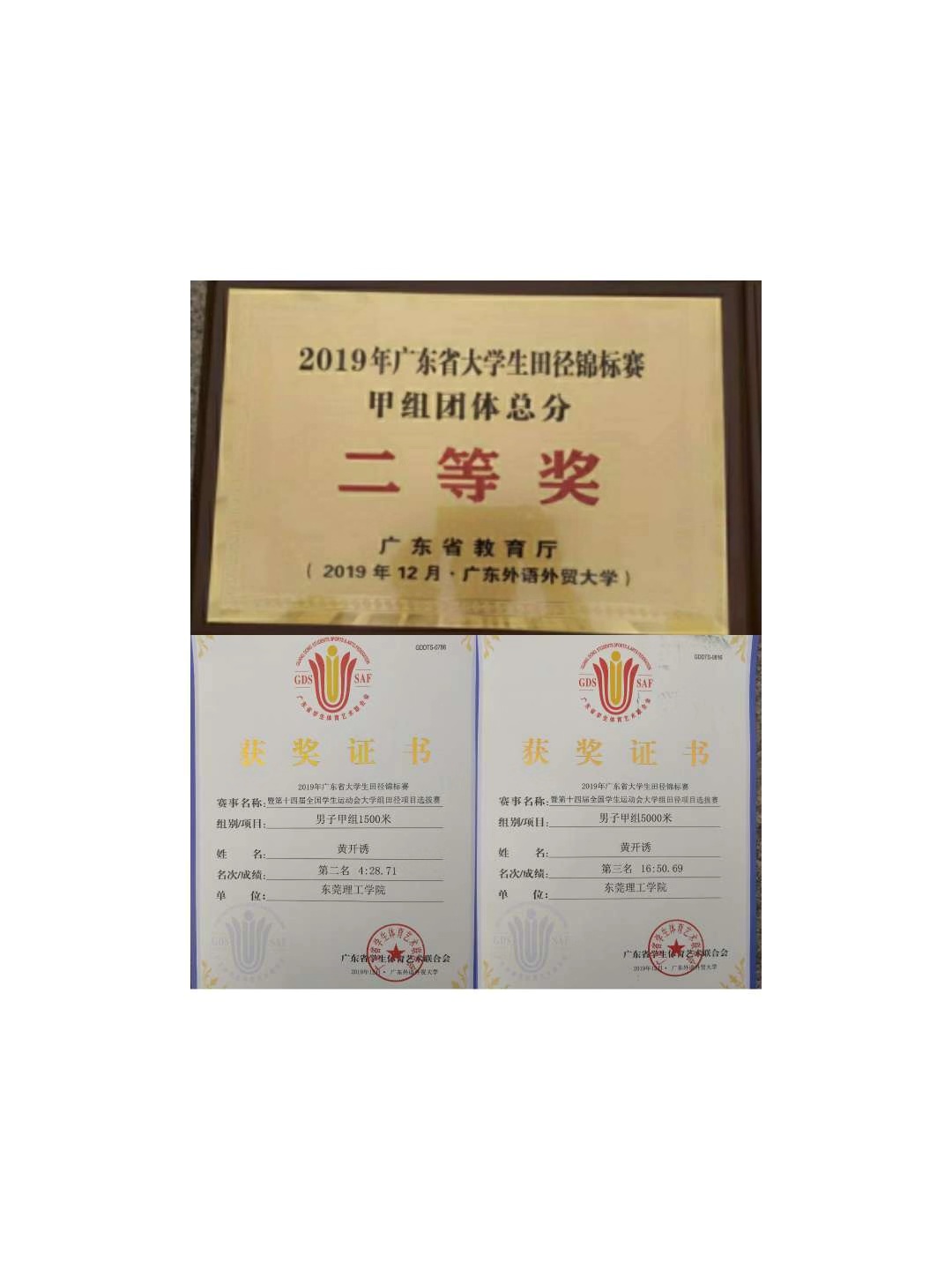 17能源1班黄开诱勇夺2019年广东省大学生田径锦标赛暨第十四届全国学生运动会大学生组田径项目选拔赛男子甲组1500米决赛第二名,5000米决赛第三名。