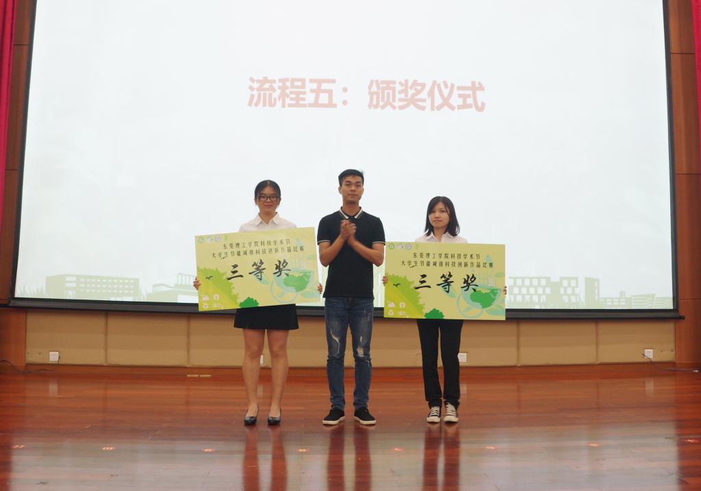 经过激烈比拼,《一种回收LNG汽化相变冷能机动式蓄冷车厢》项目团队和《金属手机外壳的发电功能》项目团队分别获得科技实物类一等奖和设计理念类一等奖;《一种基于空气源热泵技术的节能保温餐车》项目团队和《源于新能源汽车的能量回收系统》项目团队分别获得科技实物类二等奖和设计理念类二等奖;《资源化利用城市垃圾焚烧飞灰制备环保建材》项目团队和《一种城市分布式垃圾自动回收处理系统》项目团队分别获得科技实物类三等奖和设计理念类三等奖;《基于热电制冷技术的汽车座椅冷却系统》、《磷酸铁锂的低温合成技术及开发应用》和《一种用于污泥干燥的热发生子系统设计》项目团队获得科技实物类优秀奖,《一种余热回收发电装置》、《造纸污泥热泵干燥系统》、《工业蒸汽机组乏汽增压回收系统设》项目团队获得设计理念类优秀奖。柳卓君、左远志、谢真葵、何清分别为获奖团队颁奖,并合影留念。