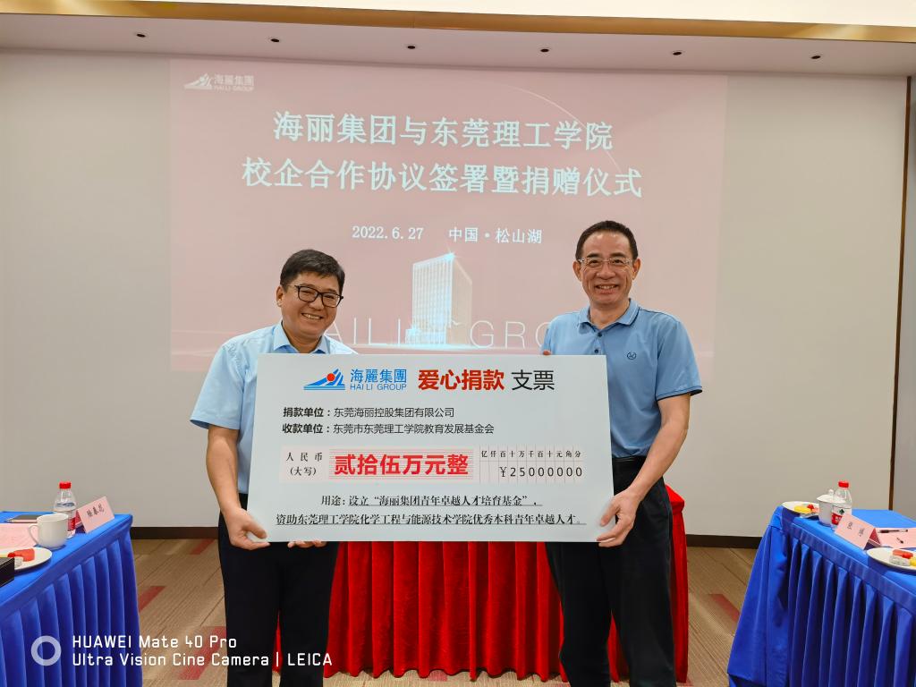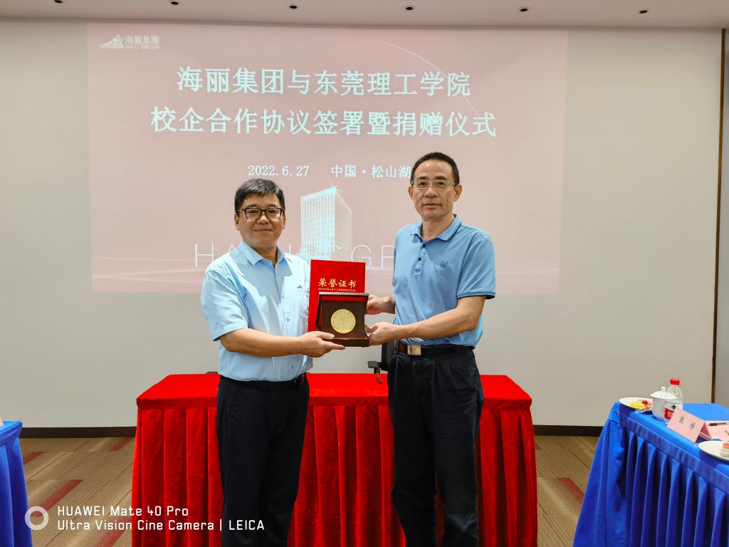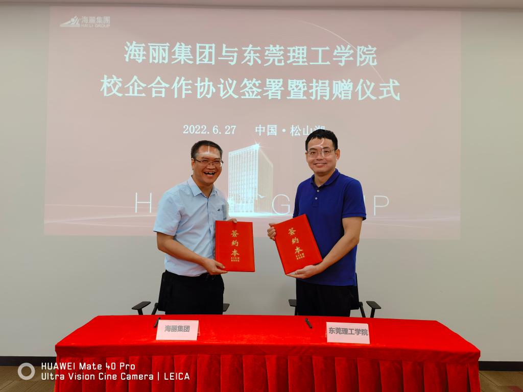 党委书记兼院长徐勇军与海丽集团副总经理赵海红代表校企双方签署了捐赠协议。徐小军总经理向杨敏林副校长递送了捐赠支票,杨敏林副校长代表学校向徐小军总经理颁授捐赠荣誉证书并回赠纪念品。
