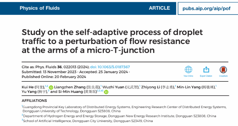 腐漫画 广东省分布式能源系统重点实验室黄斯珉团队在美国物理联合会旗下流体力学顶级期刊Physics of Fluids上发表题为“Study on the self-adaptive process of droplet traffic to a perturbation of flow resistance at the arms of a micro-T-junct...